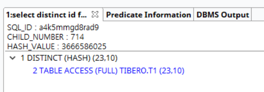 책에서는 오라클11 버전으로 작성되어있으나 내 pc에 설치된 티베로에서 실행계획을 확인해보았다. 책에서 설명한 내용과 같이 distint문이 작성된 동일 쿼리라 할지라도 unique index 가 있는 경우는 불필요한 distinct문에 해당하기 때문에 실행계획에 DISTINCT (HASH) 부분이 생략된다.